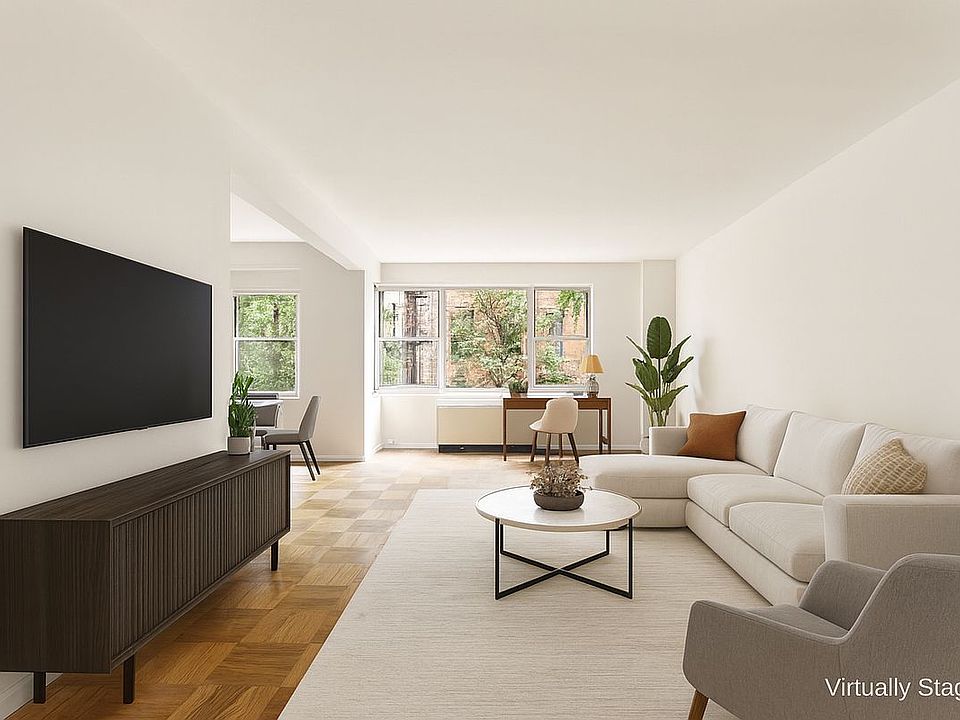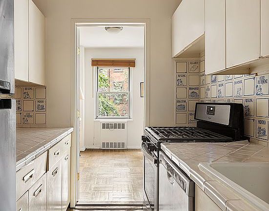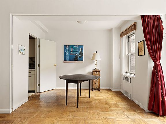 Upon entering, a gracious foyer opens to a flowing layout with seamless connection between the living room, dining alcove, and kitchen. The expansive living room stretches an impressive 30 feet, with oversized north- and west-facing windows framing views of treetops and historic townhomes along East 9th Street—the quintessential Village outlook. Adjacent to the living area, the versatile dining alcove can easily serve as a home office, nursery, or guest room.