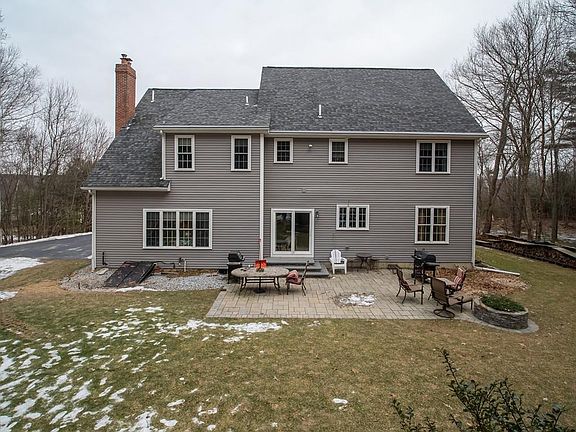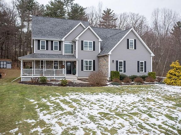 Elegant Colonial in beautiful Wamsutta Estates! Quality construction throughout w/ great flow: Granite kitchen w/ maple cabinets leads into sunken great room w/ vaulted ceiling & wood stove fireplace; or into open formal dining & living room with tray ceilings & panoramic windows; or out onto cozy farmers porch to take in the beautiful views. This 4 bedroom 3 car custom home is a must see! Hardwoods on 1st floor, recent boiler, sprinklers, wired for alarm. Smartly built with air/water radon, & water filtration systems! Huge master w/ sitting room, bath, vanity area & walk-in closet. Freshly painted, recessed lighting, generous bedrooms, extra blown-in insulation, 2nd flr laundry w/cabinets & convenient sink! Newer Pella sliding door leads to beautifully landscaped outdoors. Enjoy the privacy while you sit around the built-in fire pit and expansive custom patio. Additional detached covered bridge style garage & shed. Lower level partially finished w/area of seemingly endless storage!