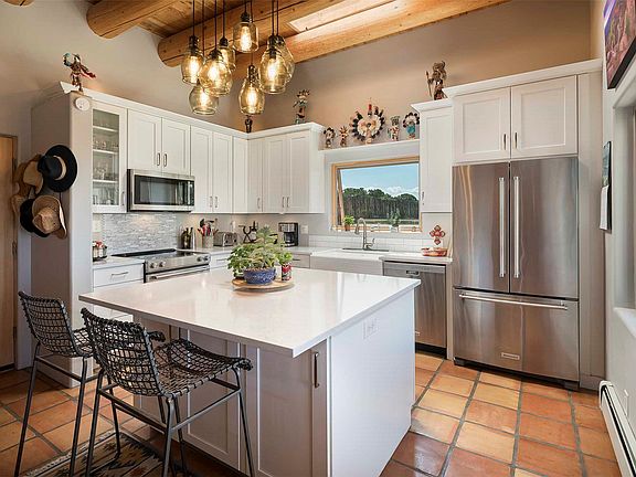 Kiva fireplaceFully fenced yardShaded outdoor living spacePlenty of natural lightSaltillo tile floorsBeautiful viga ceilingsLarge center island