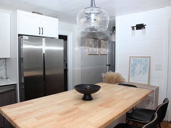 Modern kitchen with stainless steel appliances, butcher block island with seating for four, and ample cabinetry