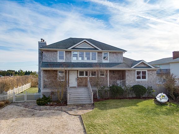 A true beach home in the nautical hamlet of Remsenburg. This inviting, turn key home is perfect for boat lovers & those wishing easy access to the waterways. It offers front& rear yards, covered front porch along w/ private dock, not only to admire serene views of Moriches Bay but for your water toys, as well. Designed to maximize the abundant water views, this homes' living room, eat in kitchen, cozy living & dining rooms are located on its sun drenched, upper level w/ vaulted ceilings that create a most spacious, open interior design. A lovely master en-suite, two additional cheery, bright bedrooms & a generously sized family room are located on the home's first level. Best of all, is a full width, south facing, outdoor deck that engages the home's beautiful interior, beach style living space. Expansive rear deck is perfect to entertain on, admire neighboring sailing club's activity or just be intoxicated w/ the renown Hampton sunsets.