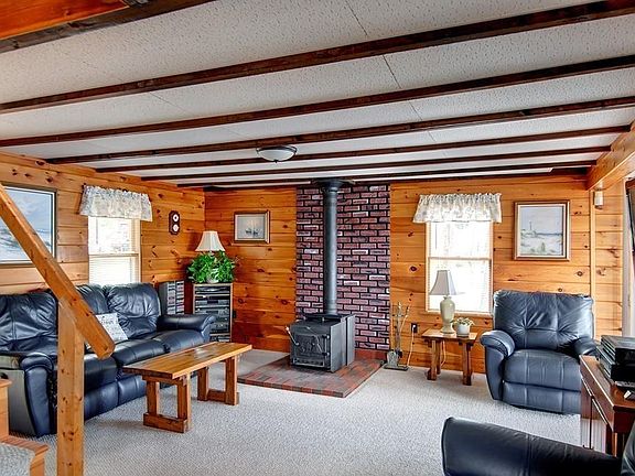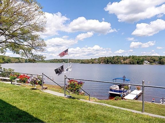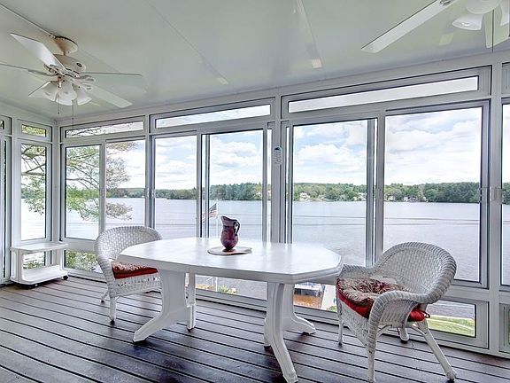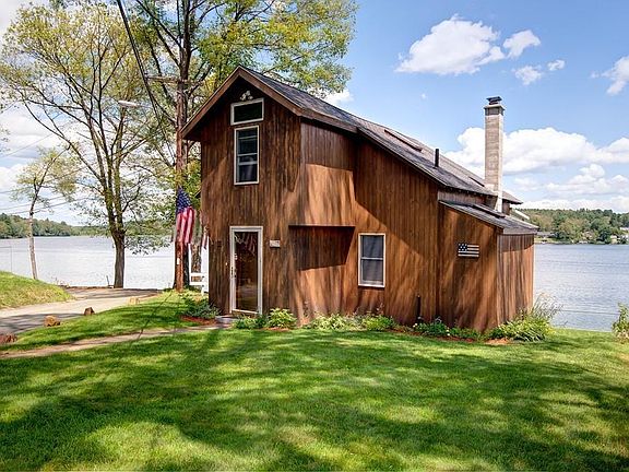 Lake Wickaboag home with 50 ft lake frontag in MINT/updated CONDITION and larger than it looks! TWO 24x8 sun room ,with two ceiling fans, will give you a glorious view/escape to Lake Wickaboag, fully recreational man-made lake covering 320 aces +(-).You won't want to leave home as life in this property will feel like eternal vacation. Natural wood shingle exterior/ beautiful knotty pine interior with LR with wood stove, DR, kitchen/ new cabinets, full bath and sun room on floor one. The second floor has three beds, a loft area and an office. Enter basement by going down deck stairs to lower sun room. Basement with 1/2 bath, laundry, and work shop & another sun room, with walk out to beach. 30 yr. archi shingle roof, 2012 heating system, replacement windows, new water tank, Central Air 2012, trex deck. Newer appliances too. An additional lot is deeded with this home, #12, and provide area for parking, two sheds, and the 2000 septic system. Security system. PRISTINE HOME!