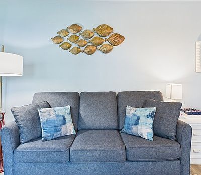 Beachside Daze is fully furnished and thoughtfully appointed for a relaxing beach vacation. The private ground-floor patio features bar-height chairs perfect for sipping coffee or enjoying an evening drink while catching the breeze. The open layout connects the living space and kitchen, making it ideal for family meals or game nights.