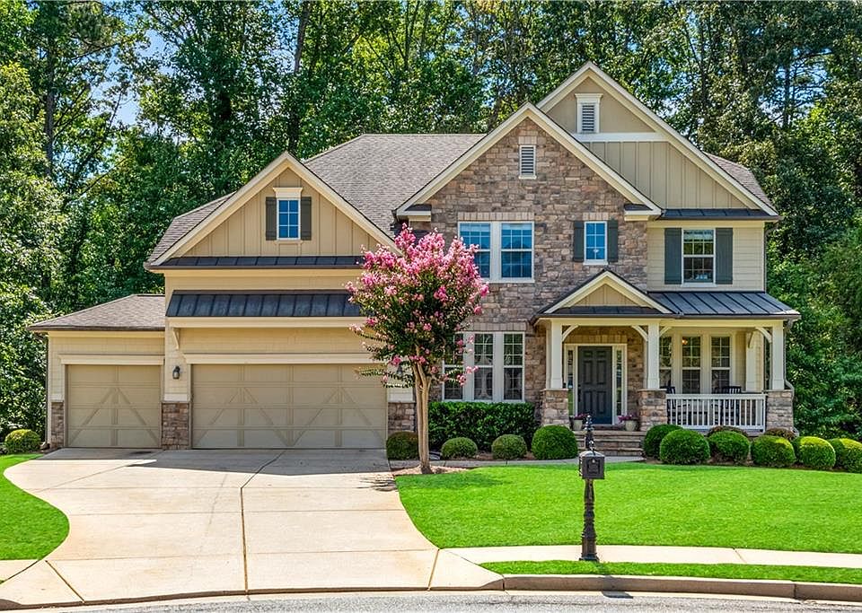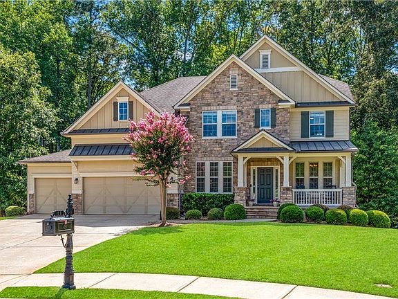 Tucked away on a quiet cul-de-sac in a gated community, this stunning 2-story Craftsman home offers the perfect blend of elegance, space, and comfort. Boasting 6 bedrooms and 4 full bathrooms, a 3-car garage, and a fully finished terrace level, this home has room for everything and everyone. Step into a grand 2-story foyer that leads into a thoughtfully designed main level. You'll find a private office, a formal dining room perfect for entertaining, and an open-concept layout connecting the spacious great room, breakfast area, and kitchen. The kitchen is a chef’s dream with richly stained cabinetry, granite countertops, island, and walk-in pantry. Upstairs features 4 generously sized bedrooms, including a luxurious oversized primary suite with his-and-hers walk-in closets. The spa-like en-suite bath includes dual vanities, a soaking tub, and a separate shower bathed in natural light. Bedroom 2 features its own walk-in closet, while bedrooms 3 and 4 share a convenient Jack-and-Jill bath. A separate elevated loft space provides the perfect spot for a second office, playroom, or media room! The finished terrace level adds even more living space, complete with a bedroom, full bathroom, kitchenette, and a large entertainment area ideal for hosting guests or relaxing with family. There is also plenty of storage in the unfinished space. Enjoy peaceful mornings and evenings on the rocking-chair front porch, and experience wooded privacy in the backyard. This home is located in a gated and well-maintained community with excellent schools nearby. As an added bonus, internet and basic cable are included with HOA fees. Close to shopping and restaurants!