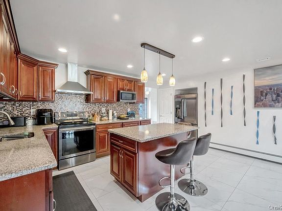Expanded 4-Bedroom, 3-Bath Home Fully Renovated in 2017 Modern kitchen with stainless steel appliances and granite countertops Wood flooring throughout the first floor Two-zone central air conditioning (units installed in 2017 and 2021) Updated bathrooms with stylish finishes 200 AMP electrical service LED lighting throughout the home Boiler replaced in 2021 with above-ground oil tank Roof is 12 years old Updated windows Potential mother/daughter setup Beautiful stone fireplace Spacious family room with fireplace First-floor den and sunroom with 4 skylights Backyard features pavers and a large deck perfect for entertaining Double car driveway for plenty of parking Universal electric car charger Soffit lighting for enhanced curb appeal Modern chandelier and accent lighting throughout