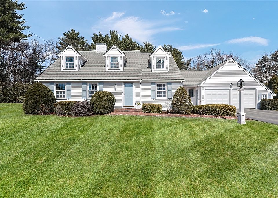 Location, Location! Classic Cape located in a sought-after neighborhood, less than 1/2 mi from schools & Booth Playground & only 1 mi from the picturesque town common w/ sidewalks leading the way. The home features a well-designed layout w/ a 1ST FLR PRIMARY BEDRM for added privacy & ease of 1 level living. The LARGE LIVING RM is an inviting space for relaxing & entertaining, featuring a cozy FIREPLACE, a BAY WINDOW for plenty of natural light, & built-in shelves. The generous dining room is perfect for everyday meals or gatherings, while the 1st flr OFFICE provides a quiet retreat for work or study. Upstairs, you'll find 3 add’l bedrms all w/ built in drawers, a full bath & a separate WALK-IN CEDAR CLOSET. A PARTIALLY FINISHED BASEMENT is ready for your personal touch to create a playrm, home gym, or add'l living space. Step outside to your own private oasis, w/ a LEVEL YARD, PATIO & inground POOL. A 2 CAR GARAGE, Generac GENERATOR & unique BOMB SHELTER complete this amazing home!