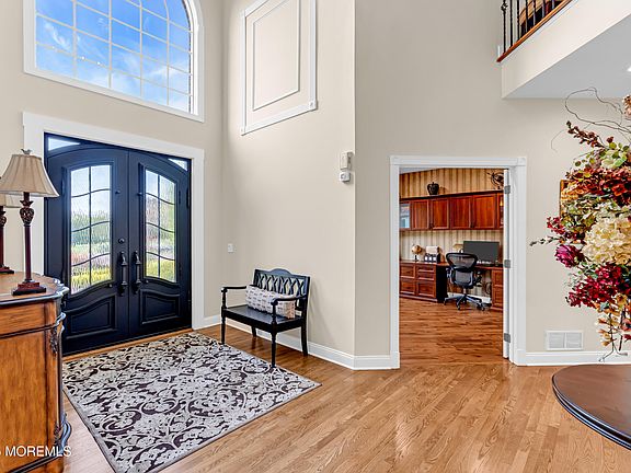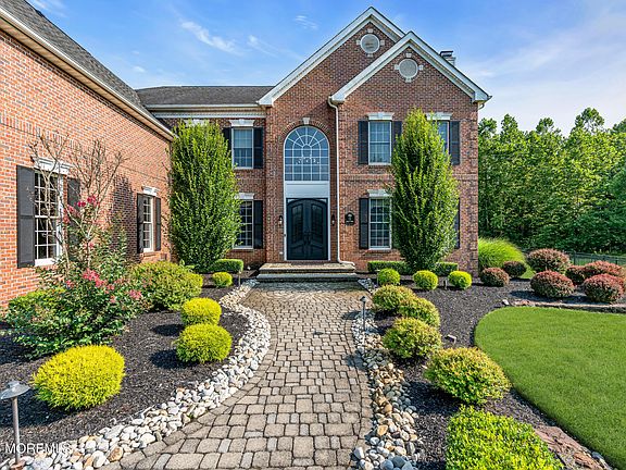 Stunning brick-front Colonial situated on a premier lot at the end of a cul-de-sac and backing to over 100 acres of preserved land in the highly desirable Manasquan River Crossing. This exceptional home welcomes you with a beautifully landscaped yard, a paver walkway, and elegant double entry doors with a palladium window above, opening into a grand two-story foyer with hardwood floors throughout the entire first level.