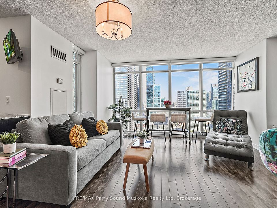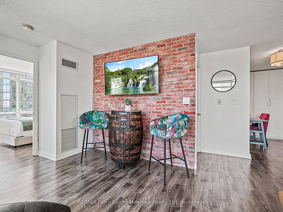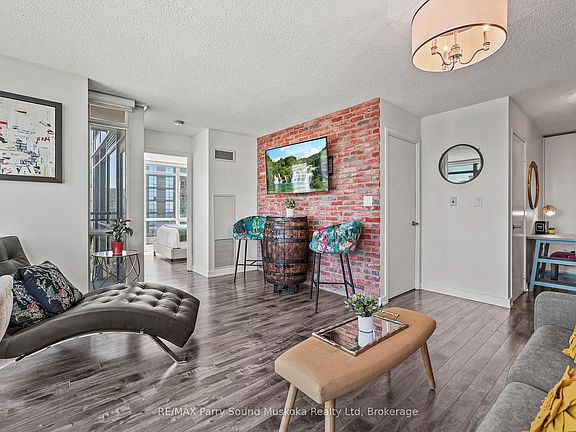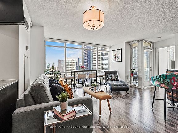 Stunning city view, CN Tower/Rogers Centre, Water view from balcony. 31st floor.1+1 corner unit will leave you breathless and wanting to move in immediately. Floor to ceiling windows with automatic zebra shades blinds. In suite laundry. Spacious living area. Built in storage closets. 1 parking space and 1 locker space. Games room, work stations, indoor pool, 27th floor hot tub room. Recently renovated gym. Pets welcome. Across from school, community centre, park and grocery store. Just a hop skip and a jump onto the highway or public transit.