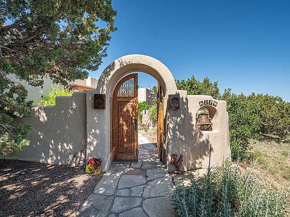 Exquisite Eastside Santa Fe 2700 sq.ft home in Eldorado built by Timothy House. Two beautifully landscaped, well established walled gardens create a private oasis on the south, west and north sides offering delightfully colorful views from the long grand 14ft high great room and dining room ceiling with 8ft high Pella windows. French doors lead out onto a large portal and 3 fireplaces including one in the garden for enjoyable outside entertainment. Viga beams, bancos, corbels and nichos add to the Santa Fe ambience and character. A lovely well designed kitchen featuring a large central island, granite counter tops, travertine backsplashes, custom cabinetry and updated appliances. The large owners suite includes a sitting area and kiva fireplace. A new silicone roof was installed in 2023 with a 20 year transferable warranty. A two zone central GFA heating and air-conditioning system on the roof makes for comfortable living year round. The guest area includes a large office which can double as a 3rd bedroom, the Murphy bed is not attached and will not be staying. There is even a secluded area for growing your own veggies. All this with Eldorado amenities close by, local shopping and services only minutes into Santa Fe.