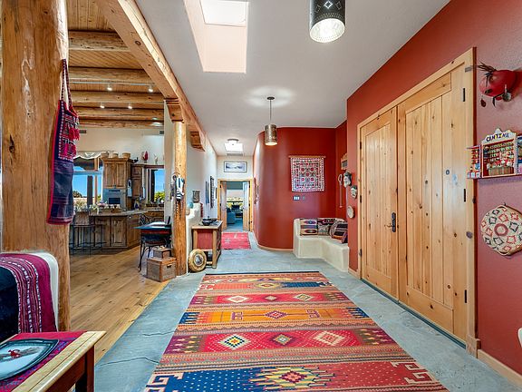 Priced to Sell! Exquisite Eastside Santa Fe 2700 sq.ft home in Eldorado built by Timothy House. Two beautifully landscaped, well established walled gardens create a private oasis on the south, west and north sides offering delightfully colorful views from the long grand 14ft high great room and dining room ceiling with 8ft high Pella windows. French doors lead out onto a large portal and 3 fireplaces including one in the garden for enjoyable outside entertainment. Viga beams, bancos, corbels and nichos add to the Santa Fe ambience and character. A lovely well designed kitchen featuring a large central island, granite counter tops, travertine backsplashes, custom cabinetry and updated appliances. The large owners suite includes a sitting area and kiva fireplace. A new silicone roof was installed in 2023 with a 20 year transferable warranty. A two zone central GFA heating and air-conditioning system on the roof makes for comfortable living year round. The guest area includes a large office which can double as a 3rd bedroom, the Murphy bed is not attached and will not be staying. There is even a secluded area for growing your own veggies. All this with Eldorado amenities close by, local shopping and services only minutes into Santa Fe.