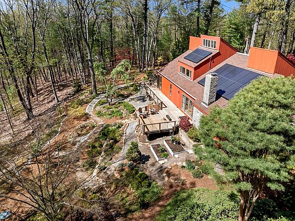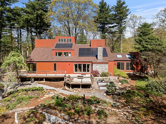 Stunning Contemporary home on a 2+ acre setting with cul de sac privacy. Surrounded by natural rock gardens, peaceful walking paths, and unique plant specimens, this home offers a relaxed, nature-inspired lifestyle. Features include an expansive wrap-around deck, floor-to-ceiling Cape Ann granite fireplace, and open-concept flow. The newer septic system, solar system for energy efficiency, along with many other updates, and an early 2000 home remodel provide for a move in experience that shows a well-cared for and thought out home. A gourmet German SieMatic kitchen with premium Wolf, Sub-Zero, and Miele appliances opens to a large light-filled dining area with panoramic views. The First floor Main Bedroom suite with private deck and sitting room complements the upstairs suite and another bedroom. Lower level includes a workshop, exercise room, bedroom, and full bath. If unique versus cookie cutter is your style and you crave back to nature, this home and setting will delight you!