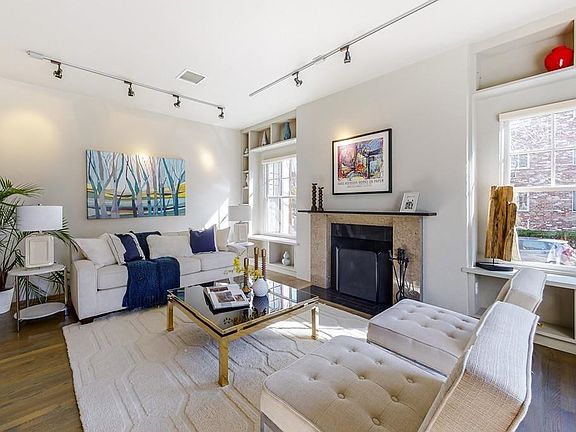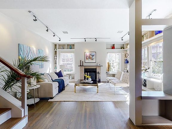 Harvard Square. This dramatic, light-flooded, exceptonal home has windows on 3 sides with views of the private surrounding grounds. The front gate and walkway to the welcoming private porch is the entry for this home only. First floor is open concept, highlighting the living room with FP and custom shelving; the sleek kitchen equipped with SS appliances, gas cooktop, vented hood, TV and bar; and French doors in the dining room to the private deck, patio and left side yard. The 2d floor open lounge/office is enchanting, surrounded by windows with doors to the L-shaped deck; one large bedroom with an FP was used as an office and could be a mr. bedroom; the 2d bedroom has access to the deck as well. The 2d floor bath has a walk-in shower. The mr. suite on the 3d floor has built-ins, gas FP; walk-in closet with closet system; 3 skylights; oversized 4-piece bathroom with soaking tub, TV, and w&d closet. 2 side-by-side parking in underground garage; 2 storage rooms. Near T and everything!