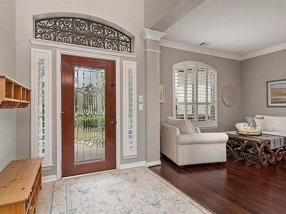 Immaculate waterfront home on an oversize cul-de-sac lot in Creekside Park. Gorgeous hickory hardwood floors in formal dining & living, study, and master. Beautiful millwork throughout including crown molding and plantation shutters. Dream island kitchen with Cambria quartz counters, breakfast bar, and stainless steel GE Profile appliances opens to the 2-story family room with gas log fireplace and and wall of windows providing stunning views of the backyard paradise and neighborhood lake. Private master suite has water views and a spacious bathroom with separate vanities, corner whirlpool tub, oversize shower, travertine counters and large walk in closet. 4 large secondary bedrooms and huge game room overlooking lake upstairs. Resort-style back yard includes sparkling pool/spa with rock slide and waterfalls, covered patio with bar and gas fire pit, pergola, and lush landscaping, and breathtaking sunrise views. Fantastic location-short walk to school and park.