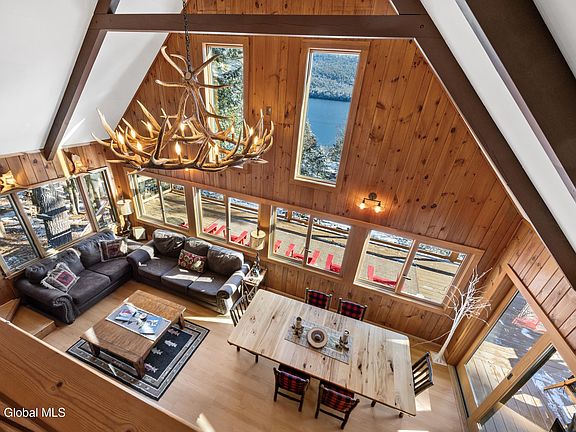 Northwest Bay home with large dock on .73 acres and panoramic views of the lake. This home was featured in Travel and Leisure magazine as ''Best of The Adirondacks'' summer 2024. This is a rare find as cozy as can be and quiet and yet less than a 5-minute drive to Bolton Landing. Vaulted ceilings, open floor plan, brick fireplace, large expansive deck for entertaining and huge firepit. Dream custom bunks for kids! All furniture and accessories included. Turn key....Must see.......