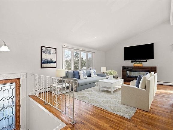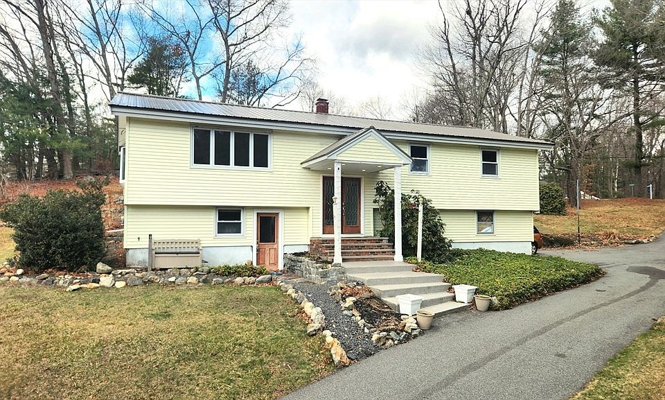 Tucked away on a quiet cul-de-sac, this split-entry features an open layout, vaulted ceilings, freshly painted interior, refinished HW floors and a metal roof. The spacious living area flows into the sunroom with a cozy gas fireplace, perfect for chilly evenings. Enjoy coffee on the back deck or by the bow window overlooking the yard. The open kitchen boasts custom refinished cabinets, updated SS appliances, ample dining space, and a new built-in pantry. The spacious primary bedroom includes an attached half bath, while the fourth bedroom, with its own entrance, is located downstairs with access to a second full bath and laundry. The finished lower level can serve as a home office, gym, or media room. A 2-car attached and 2-car detached garage provide ample parking and storage. Located near 125, I-93, 20 miles from Boston, and minutes from Fosters Pond, Harold Parker State Forest, and Goldsmith Woodlands, this home offers a peaceful retreat with easy city access, perfect for commuters!