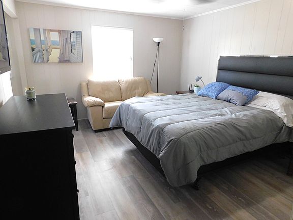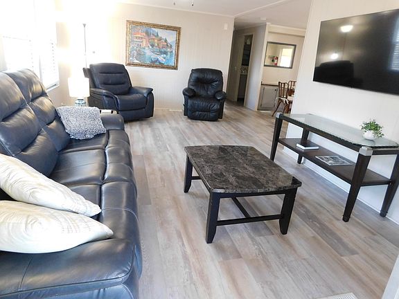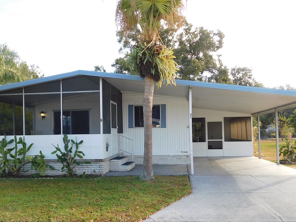 Just in time for the Holidays!! Immaculate 2 bedroom 2 bath home boasts efficient and masterful renovation within the last 18 months. Home offers 1032 square feet of spacious open concept living with a comfortable modern and welcoming vibe. New gorgeous laminate flooring is beautifully complimented by impeccable high end furnishings and well apportioned personal décor. During renovation, all subfloors were updated to 3/4" plywood ensuring longevity with sturdiness and solid performance. Home interior boasts fresh paint throughout with updated light fixtures and ceiling fans. Both bathrooms are updated with attractive high rise vanities making sink access safe and comfortable. Artfully functional kitchen enjoys stainless steel appliances, freshly painted gray cabinets, white countertops and backsplash, and an outside facing window at the kitchen sink. Dining area is elegant but comfortable with a built-in storage unit sporting additional countertop space, lower storage cabinets and upper cabinets with glass front doors. Amazing 12' x 20' living area is furnished with a new Maverick Premium Leather dual recliner sofa and large recliner chair with electronic controls. The master bedroom is a generously spacious 12' x 16' retreat with new headboard on the queen bed, comfortable couch for relaxing activities, and plentiful storage with one double sliding door closet and one walk-in closet. It enjoys a great bath ensuite with private shower and toilet, and additional storage cabinets. Home has plentiful accessory spaces including a 10' x 14' screened front lanai adjacent the living area, a 12' x 20' screened carport lanai, and an 8' x 10' utility shed with laundry. Home exterior presents great curb appeal with fresh paint all around and is outfitted with mesh screen behind brick skirting to protect home undercarriage and vapor barrier. This home is situated on a large lot with approximately 50' x 54' of shaded back yard green space and, due to location, enjoys minimal pass by traffic. Air conditioner is barely 10 years of age and new water heater was installed 1 year ago. This home is being offered turnkey and is priced to sell. Call for a showing today and let us welcome you home for the New Year. Woodbrook Estates is an Active, pet-friendly, 55 Adult community- the monthly Fee Package includes: Land-lease and Use of all Amenities for $772. (No Additional Taxes.)