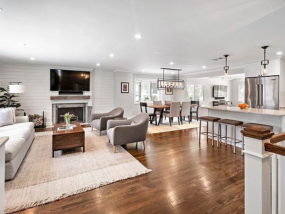 This meticulously renovated and expansive ranch-style home checks all the boxes. The open floor plan is well suited for everyday living and entertaining. Featuring a tastefully designed living room with stunning fireplace, dry bar and large windows that flood the space with natural light. An elegant dining room opens to a richly appointed eat-in kitchen with center island, beautiful crisp, white cabinetry and stainless-steel appliances. Adjacent is an expansive family room with vaulted ceilings with direct access to the deck and level manicured yard. The master bedroom suite features custom closets and marble tiled bath. There are two additional bedrooms with ample closets and a full bath on this level. The finished lower level has a large family room, laundry, office, plus mudroom with access to a two-car heated garage. All this plus newer roof, updated utility systems, central AC, Pella windows, composite deck and plenty of storage. With so many updates it feels like new.