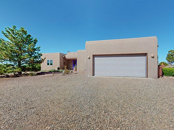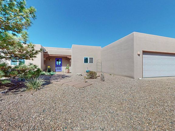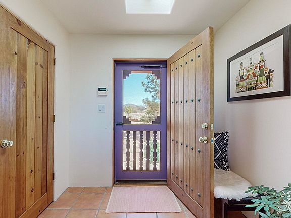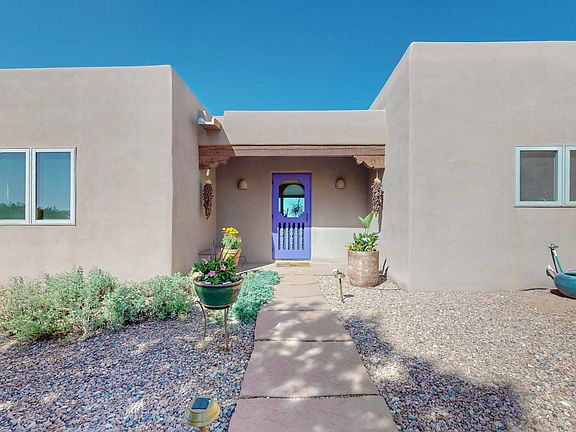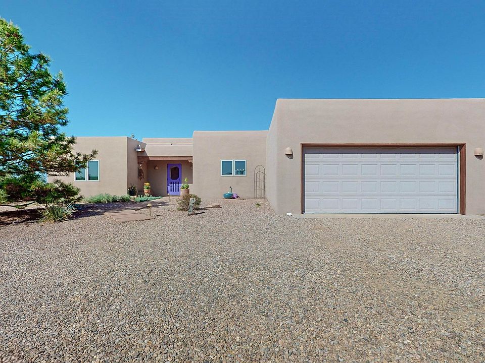 Views! Views! Views! This delightful Eldorado home has outstanding views of Sandia, the San Pedro, Jemez, Ortiz and Sangre de Cristo mountains. Every window holds a stunning vista in its frame. A beautiful Colorado Redstone rock wall leads you down the drive to a flagstone path leading to the clavos embellished front entry. This stunning open plan design built by acclaimed builder Adobeworks, Inc reflects pride of ownership. This contemporary Pueblo-style home blends a zen like symmetry with Santa Fe charm throughout. Enjoy the spacious great room with romantic corner kiva fireplace and high viga ceiling. An entertainer's kitchen opens to a formal dining room with patio doors onto the portal for outside enjoyment. There is a lovely den/library/office room, plus a large guest bedroom. A separate, private spacious owner’s suite including a large walk-in closet and spa-like bathroom. Relax on the portal overlooking your private oasis with sweeping sunset views. The 2 car finished garage also includes a level 2 car charger and there is plenty of guest parking. Conveniently close to Eldorado amenities, local shopping, school, library, trails and senior center and only minutes into Santa Fe