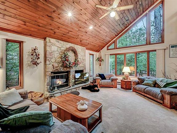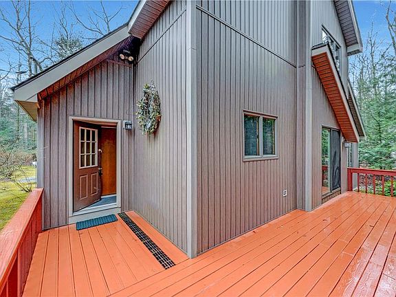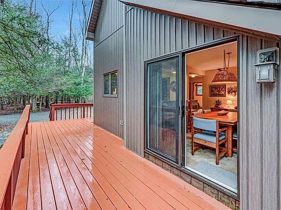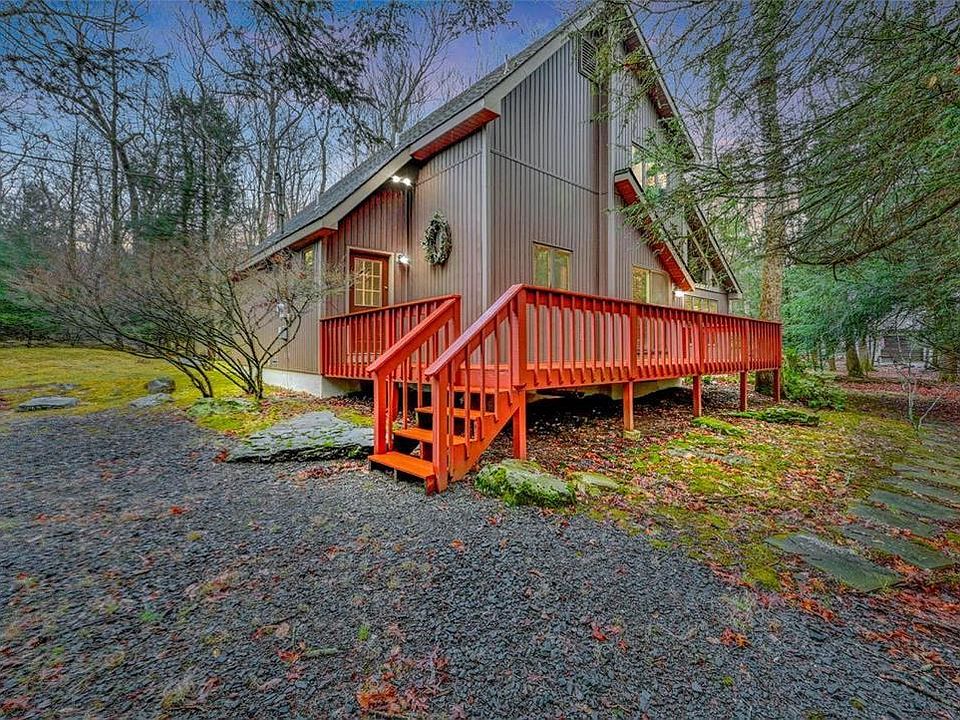 Well-Loved Contemporary Home Peacefully Perched On 1.17 Acre Corner Lot In Sought After Pocono Mountains Vacation Community! Sun-Lit Floor Plan Offers 3-4 Bedrooms, 2 Full Baths & Open Concept Living Space Highlighting Knotty Pine Cathedral Ceilings, Crown Molding & Custom Stone-Faced Wood Burning Fireplace. Kitchen & Dining Area Offer Bar Top Seating & Sliding Glass Doors To Wraparound Deck. Spacious Loft w/ Large Walk-In Closet Open To Below & Perfect For Guests Or Family Entertaining. Expansive & Private Screened-In Porch Overlooks Tree-Lined Country Setting. Upgrades Include Cedar Closets, Vinyl Siding, Newer Hot Water Heater, New Well Tank & More. Situated In Tranquil Cul-De-Sac Setting Amongst Lush Greenery. Just Moments To Amenities & Large Community Lake. Welcome To This Beautiful & Inviting Home!