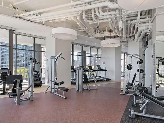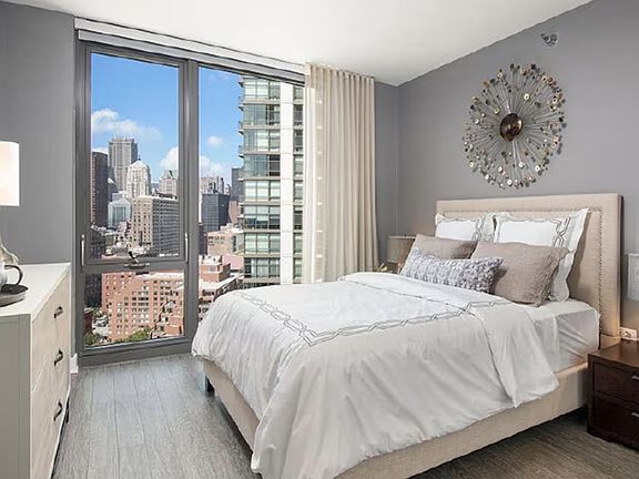 Unit features floor-to-ceiling windows with West facing views. Hardwood floors through out, modern finishes, stainless steel appliances, kitchen island with great kitchen storage, dishwasher, gas stove, in-unit washer and dryer, walk-in shower and central A/C. Building is pet friendly and has 24 hr front desk staff, fitness center, business lounge, co-working spaces, printing options, event room, cinema room, dog run, outdoor pool and more!