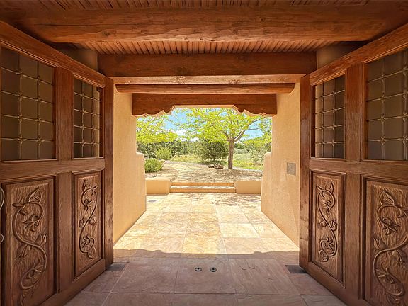Discover unparalleled luxury in this meticulously crafted estate that seamlessly blends timeless elegance with regional architectural charm. Set within a private courtyard sanctuary surrounded by mature trees, this exceptional home offers breathtaking Jemez and Sangre de Cristo mountain vistas alongside Las Campanas golf course views.