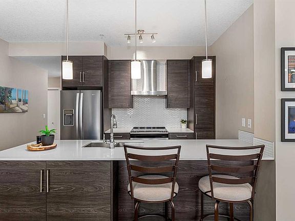 Experience resort-style living every day at the highly coveted Westman Village on Mahogany Lake. This exceptional 2-bedroom, 2-bathroom fourth-floor corner condo is more than a home—it’s a lifestyle. From the moment you arrive, you’ll see why Westman Village is one of Calgary’s most sought-after communities, offering an unmatched blend of luxury, convenience, and connection. Inside, you’ll be welcomed by expansive wraparound windows that flood the home with natural light and frame serene courtyard views. The open-concept design flows seamlessly from the chef-inspired kitchen with modern finishes and sleek cabinetry into the bright living and dining areas, making it perfect for both relaxing and entertaining. Both bedrooms are generously sized, each with large windows that keep them light and airy, while the primary retreat offers a walk-in closet and private ensuite. A second full bathroom adds convenience for guests or family. Step outside to your private wraparound patio, complete with a unique two-sided deck—enjoy sunshine with your morning coffee on the south side and soak in the warmth all afternoon on the west side. Whether it’s the soothing sounds of the courtyard fountain, peaceful evening views, or even the Stampede fireworks in summer, this outdoor space is designed for every moment. Adding to its appeal, this condo is thoughtfully situated in a corner position with only one attached neighbour, providing extra privacy and tranquility. It also comes with a titled underground parking stall, a convenient private storage locker directly in front of your parking space, 24-hour concierge service, top-notch security, and ample visitor parking with EV charging stations. But what truly sets this property apart is the lifestyle that comes with it. At Westman Village, every day can feel like a vacation. The 40,000 sq. ft. amenity centre is second to none, featuring a swimming pool with a two-storey waterslide, a golf simulator, a fitness centre, a movie theatre, a full-sized gymnasium, basketball courts, a workshop, a craft studio, and beautifully appointed party rooms. Whether you want to stay active, pursue a hobby, or simply unwind, there’s something here for everyone. Dining and entertainment are at your doorstep, with renowned venues such as Chairman’s Steakhouse and Alvin’s Jazz Club just steps away, along with cafés, boutiques, and everyday conveniences. Stroll through landscaped pathways, meet friends for dinner, or take a leisurely walk along the shores of Mahogany Lake—Calgary’s largest freshwater lake with exclusive resident access. With quick access to Deerfoot and Stoney Trail, commuting and exploring the city is a breeze. If you’re looking for more than just a home—if you’re looking for a community that offers connection, convenience, and a resort-style lifestyle year-round—you’ve found it here in Westman Village.