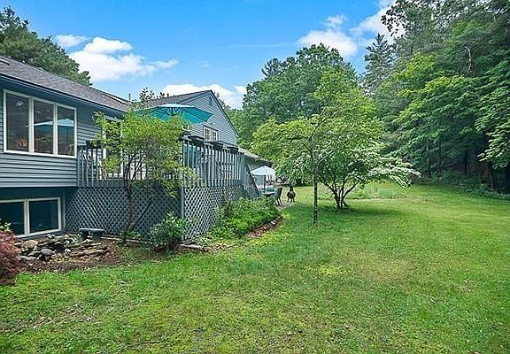 Privately situated home in Georgetown, MA! Come into your new home where the main level boast an open concept, granite kitchen with cathedral ceilings, sky light and recessed lighting leading to a fireplace living room, with hardwood floors, and a formal dining room with hardwood floors and a door leading to your attached deck and large and serene backyard. Step up to 2 large bedrooms including a master bedroom with master bath. The second bedroom and hall also attaches to full bath Back to the main level and then down another step a large, finished family with full bath and laundry room with french doors leading to your gorgeous back yard. Step down once more to another finished family room with den or office space or 4th bedroom. Attached two car garage and so much more! Just a few cosmetic touches and you're home!