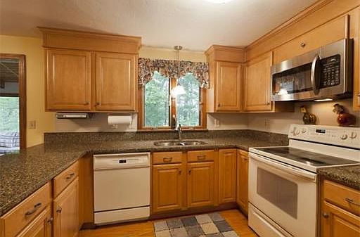 $10,000.00 toward landscaping at this price! Newer Granite, eat in Kit open to a Vaulted, Skylit "Great Rm" that overlooks wooded private setting...perfect for entertaining! 1st flr laundry, 1st Floor Office & Exercise room complete w/Hot Tub! A cozy fireplaced Fam rm off kitchen w/a "warming " feel. Large Din Rm, Huge Liv rm w/walk in Bay window. Harwd flrs up & down. Master bed w/walk in closet & Bath...both baths up recently done..Heat & electric newer, 3 yr roof, replacement wind