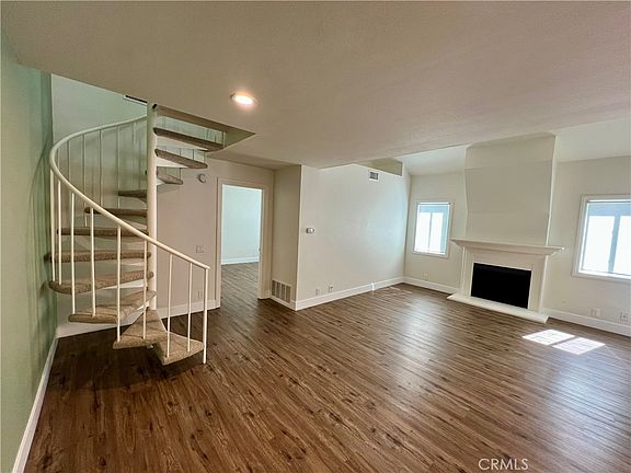 The generously sized primary bedroom features mirrored wardrobe doors and an ensuite dressing area with a quartz countertop and quiet-close cabinetry. A striking spiral staircase leads to an expansive loft, ideal as a second bedroom, home office, or flex space. New luxury vinyl flooring enhances both levels, providing easy maintenance and a modern touch.