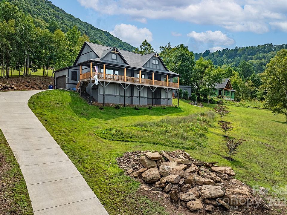 Gorgeous 3-year-old one-level home offers an open floor plan and sweeping northern views, both near and far, enjoyed from a 71' front western red cedar-lined porch. Thoughtful upgrades include a walk-in pantry, spacious laundry/mud room off primary vaulted ceilings, views from almost every room, and a finished garage with gas generator. Outdoors, a level 4000 sq ft astro-turf back garden provides a perfect play space for pets, while a fire pit creates a cozy gathering spot. A heated detached “destination shed” adds flexible space, and ample parking makes entertaining easy. Modern comfort, stunning views, and outdoor living come together in this beautiful Leicester property only 8.5 miles from Patton Ave. All of the view and none of the climb!