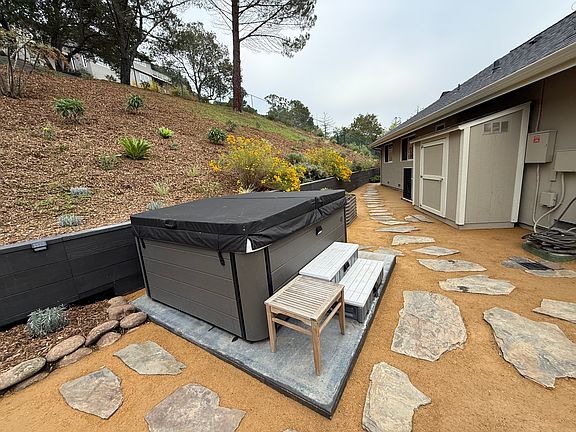 The open-floor plan great room - living room, dining room and kitchen - offer cathedral ceilings, perfect for effortless living and socializing. The living room features a gas fireplace and endless vistas that are also framed by the adjacent dining room. The large, open chef's kitchen is equipped with high-end stainless steel appliances, granite counters, walk-in pantry, second wash sink, seating bar, and built-in dining nook. The great room opens to a sunny deck for dining al fresco, while the backyard oasis features a hot tub, upper patio with sweeping views of Mount Tamalpais and surrounding hills, and a secluded side patio with seating around a propane fire pit. A cozy, multi-use den with built-in seating provides additional space to relax and stream entertainment with the included WiFi.