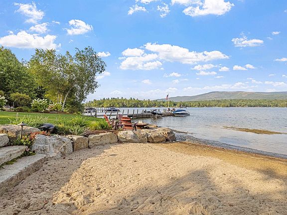 Welcome to your private lakefront haven with sweeping views of the Ossipee Mountains & a front-row seat to the iconic Castle in the Clouds. This stunning property offers 100' of pristine shoreline, a walk-in sandy beach, a private dock, and a beautifully level lot—perfect for enjoying all four seasons in comfort and style. Step inside from the oversized 3-car attached garage, which features radiant floor heating, a bonus overhead door for additional storage, and direct access to a spacious mudroom. The first floor offers a bedroom and ¾ bath, a pantry/laundry room, and an open-concept kitchen and living area that has been thoughtfully remodeled with modern finishes. A double-sided stone gas fireplace anchors the living room and also warms the inviting four-season porch.From the porch, step out into a newly built outdoor kitchen and living area, complete with a pergola with sunshades, perfect for entertaining. The level lawn leads directly to the firepit area and the walk-in sandy beach, making it effortless to enjoy lakeside living to the fullest. Upstairs, you’ll find two bedrooms that share a full bathroom with a soaking tub. Follow the unique lighthouse-style stairway to a private suite above the garage, where a gas fireplace, lakeside balcony, ¾ bathroom, bunk/game room, and wet bar create the ultimate guest or entertainment space. Additional updates include a newly paved driveway with paver accents and a redesigned entrance that adds to the home’s impressive curb appeal.