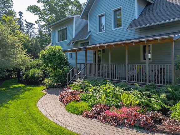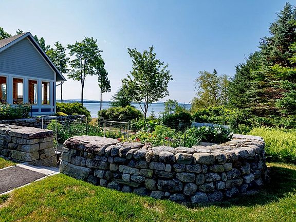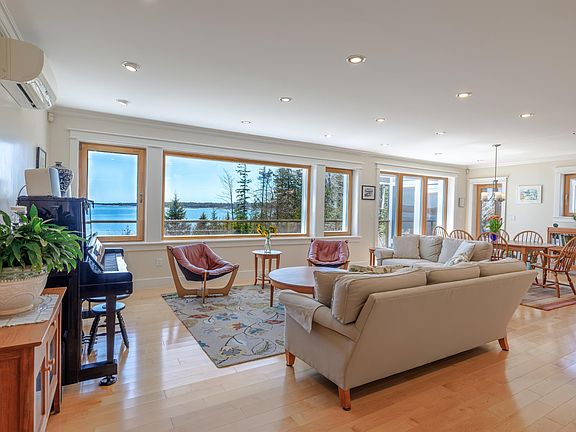Welcome to 11 Goldfinch Lane, a bright and airy ultra-efficient house with spectacular views set on more than 290 feet of deep water oceanfront on Newbury Neck in Surry. A sloping path leads down to a gravel beach perfect for swimming, playing or launching kayaks. Designed by Phil Kaplan of the renowned Kaplan and Thompson Architects, this three-bedroom, 2.5-bathroom home is a model of state-of-the-art energy use, certified by the PassivHaus Institute. With 36 solar panels generating more power than the house consumes and a whole-house ERV system providing a continuous flow of fresh, filtered air, the home's environmentally conscious design creates a uniquely comfortable and energy-saving year-round living space. The primary bedroom and bathroom are conveniently located on the first floor, and the open layout streams natural light throughout. A deck facing the water and a three-season porch offer serene views of the mountains of Acadia National Park across the bay, while beautiful gardens with stone walls add to the charm. Inside, the house feels sheltered and quiet, with 18-inch walls and triple-pane glass, and there are ocean and mountain views from almost every room. Heating and cooling are powered by Mitsubishi heat pumps, with a whole-house backup generator for peace of mind. The two-car garage includes a level 2 car charger, with a large additional area upstairs for storage. Practical features like fiber optic internet, triple-pane windows, and solid maple floors complement the home's thoughtful design. Equidistant to Blue Hill and Ellsworth, this property offers exceptional convenience. Biking, hiking, swimming, and kayaking are accessible directly from the property; no car needed! The house offers a rare combination of comfort, beauty and net-zero energy efficiency. 11 Goldfinch Lane is more than a home - it's a statement of healthful living, surrounded by the beauty and magic of the Blue Hill Peninsula.