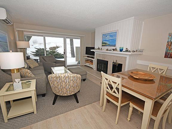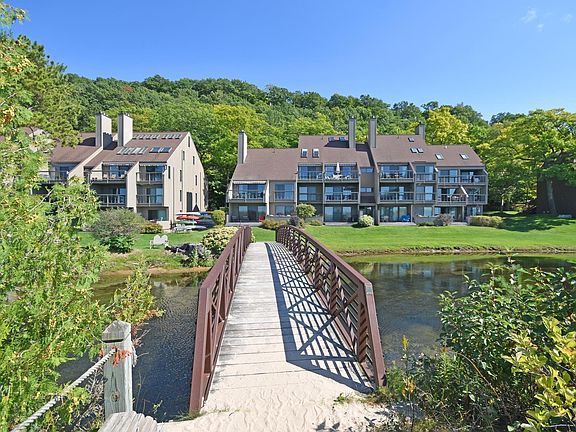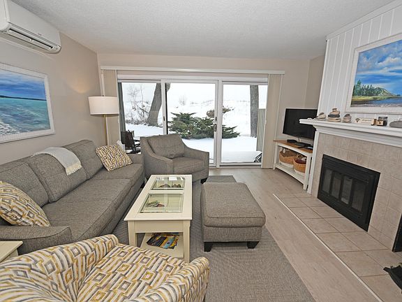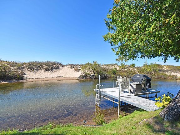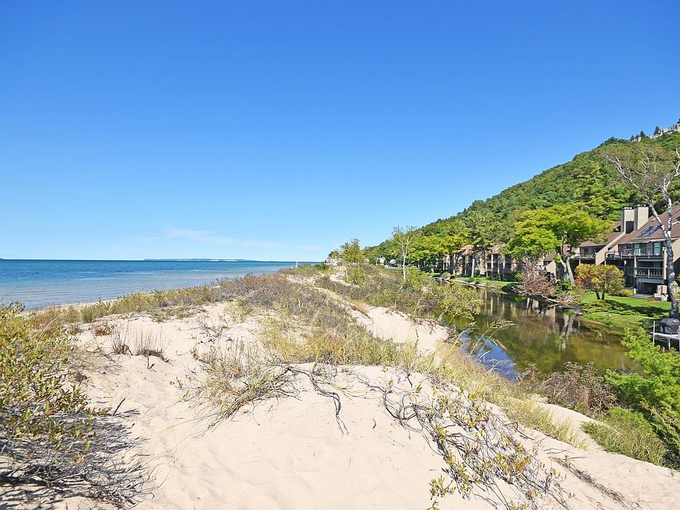 Whole ownership. Walk right out to the Crystal River from this two bedroom, two bathroom, waterfront, end unit condo, ideal for kayaking, tubing, wading, or splashing around. Just over the footbridge is also Lake Michigan, perfect for summer afternoons at the beach, or taking in a gorgeous, west facing sunset. Air conditioning has been installed, and there's a coin operated washer/dryer that's located in the lower level of the condo building. This space comfortably accommodates up to 6 people and would be a great retreat for enjoying northern Michigan and the Sleeping Bear Dunes National Lakeshore! Excellent rental history if renting is your intention. Sold furnished with some exceptions.