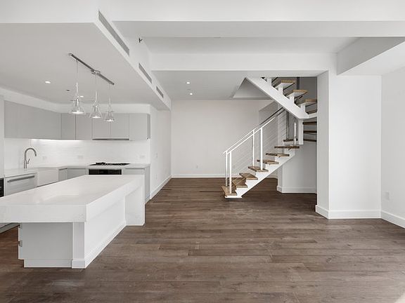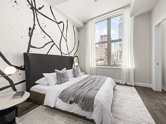 The residence features an open concept for living and dining. Features include broad plank Russian white oak wood floors, central heating and cooling, elegant tilt-and-turn Schuco windows with automatic black out shades, Crestron Smart Home System, keyless Latch entry and in-home Miele wash/dryer. The kitchen finishes indulge style and functionality with white lacquer Europlak soft-close cabinets, a spacious waterfall island perfect for morning coffee and breakfast; exquisite Caesarstone Calacatta Nuvo countertops and high-end Miele appliances. The bedroom features a luxurious en-suite bathroom with double vanity, a deep soaking tub, Marmont Matt porcelain floor and a Toto toilet.