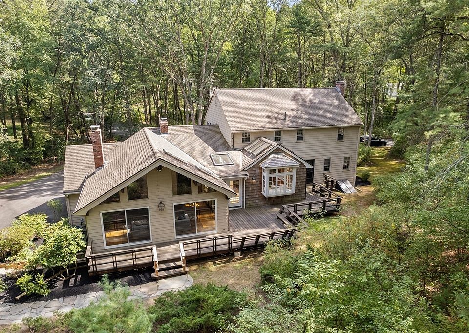 Tucked away on a beautifully wooded 1.4-acre lot, this spacious 4-bedroom, 2.5-bath Colonial offers the perfect blend of charm, comfort, and natural beauty. Thoughtfully expanded over the years and lovingly maintained by just two owners, this home is a rare find. Step into a bright and inviting formal living room, beautiful office with pocket doors and built ins the stunningkitchen features skylights, an oversized island, and a cozy breakfast nook. The open-concept design flows seamlessly into a generous dining room with a fireplace, family room showcases a custom stone hearth with a wood-burning stove, vaulted beamed ceiling additional skylights, and multiple sliding doors that provide stunning views of the private lot and easy access to the deck. The home also features an oversized two-car garage, a huge partially finished basement with unlimited potential.This home is a true family sanctuary—for those seeking peace, privacy, and a connection with nature. Whole House Kohler Generator