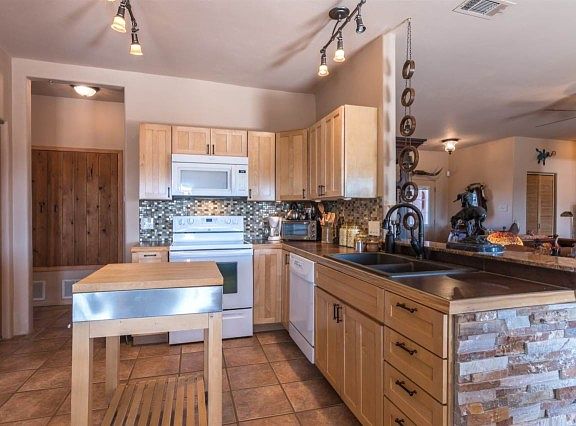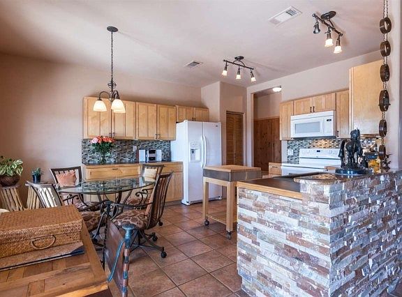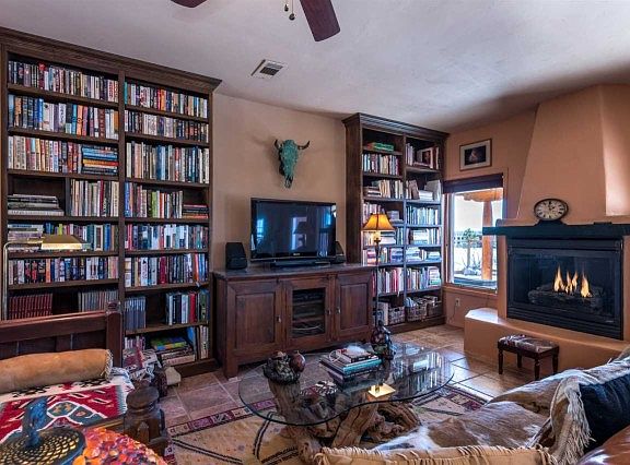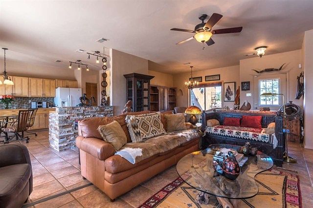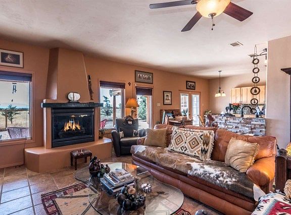 This 1700 sq. ft. home built in 2000 has many of the upgrades and amenities todays buyer is seeking: open floorplan, fantastic outdoor areas, mountain views in all directions, plaster, split floorplan, tiles flooring throughout and central air conditioning! The kitchen and breakfast nook have been thoughtfully redone with beautiful tile counters, glass tile back splash and maple cabinets with beautiful hardware. The living room is enhanced with a gas fireplace and custom built-in bookcases. The master suite boasts a generous walk-in closet, built-in linen cupboards and a tastefully updated bathroom. Each closet of the home is fitted with double hung rods for tremendous storage options. The wide back portal provides terrific opportunities for outdoor living and entertaining and features a raised kiva fireplace. It is easily accessible from the kitchen, living room and master bedroom. A two-car garage, quiet location and easy access to green space and walking trails complete this beautiful property.