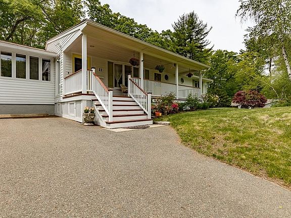Premium West Peabody Location! Bring the whole family. This lovingly maintained Ranch style home w/walk out fully finished basement has it all! An over sized covered front porch w/recessed lighting greets you as you enter to the entry area open to a huge family/living room w/beamed ceiling, plank wood flooring & a fireplace then to the gourmet granite kitchen w/stainless appliances, breakfast bar, vaulted ceiling w/sky lite, a sun room w/a gas fireplace & cathedral ceilings w/sky lite, a large dining room over looking the gracious front porch, 3 generous bedrooms & a ceramic tiled full bath w/skylite complete the first level. The finished lower level offers many living options...in-law/teen suite hosting a large family room, bedroom with private ceramic tiled bath and walk in closet, an office/bonus room, a large laundry room and a rear above grade entrance. Privately set off the road atop a knoll. Enjoy sitting on the huge rear deck overlooking the lush forestry. 2 storage sheds