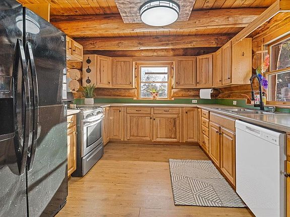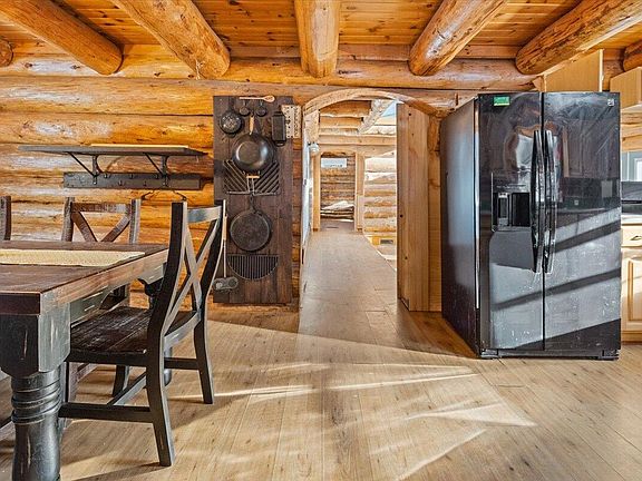 Step inside to find a spacious, open floor plan filled with an abundance of natural light pouring through large windows, highlighting the beautiful interior logs and soaring cathedral ceilings. The cozy living area is perfect for relaxation, while the well-appointed kitchen offers ample space for family meals or entertaining guests.