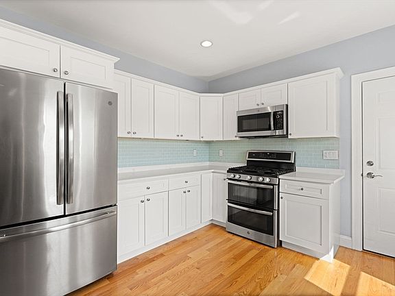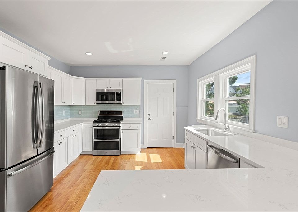 Outstanding value on a well-appointed condo in Medford! This second-floor residence offers over 1,300 square feet of thoughtfully designed living space. It includes 3 bedrooms, 1 bath, and an additional office area. The expansive eat-in kitchen features premium white shaker cabinetry, Bianco Carrera quartz countertops, and top-of-the-line stainless steel appliances. The bathroom is elegantly finished with a large walk-in shower adorned with modern subway tile. Throughout the unit, you'll find hardwood flooring and recessed lighting, creating a refined atmosphere. Additional amenities include in-unit laundry, additional storage, a communal deck and patio, and an assigned off-street parking space. Strategically located near Somerville, Tufts University, Assembly Row, Magoun Square and minutes to the new Ball Square Green Line T-Station. This property offers unparalleled convenience.