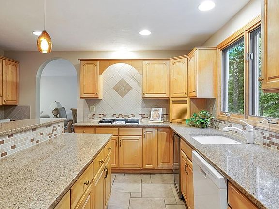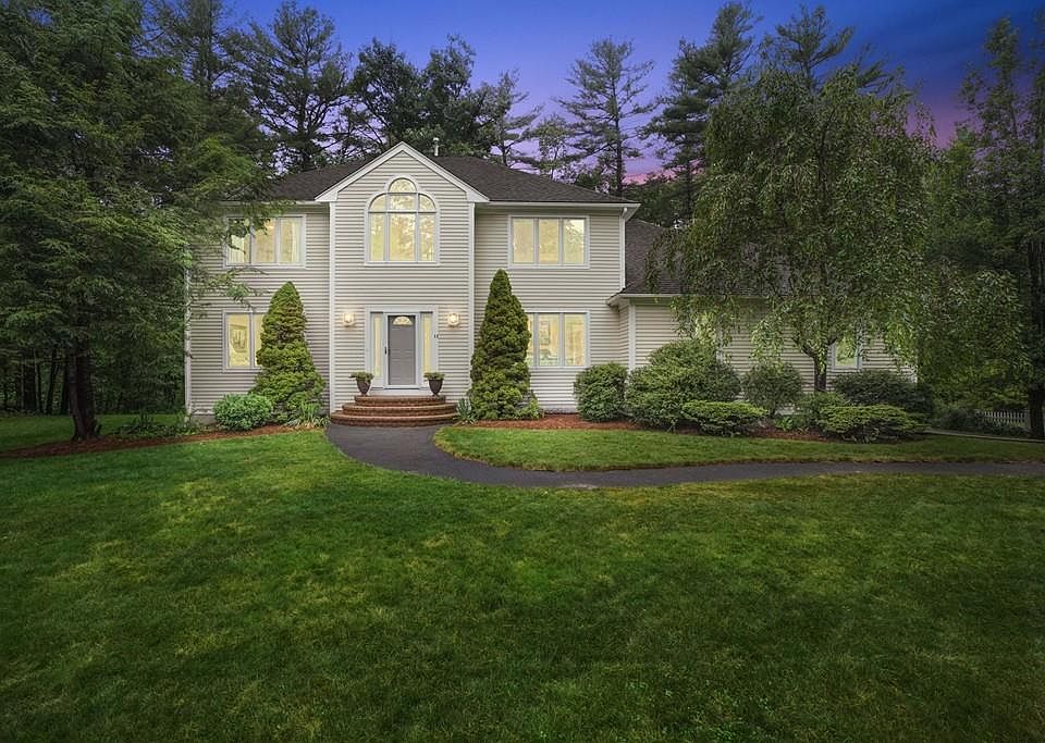 Stunning private home nestled on sought after Horizons Road. Updated kitchen with maple cabinets, island, dining area, access to deck and opens to family room. Spacious sunken family room with vaulted ceiling, skylights, access to deck and floor to ceiling brick fireplace. Private first floor office with hardwood floors. Front to back living room and dining room combo. Large master bedroom with vaulted ceiling, skylights, private bath and walk in closet that connects to additional storage space. Finished walkout lower level offers fully equipped front to back gym, game room and more. Two tiered decks overlook private yard, oversized sports court (basketball, volleyball, lax and tennis) and space for swing set or trampoline.Property abuts conservation on two sides (non- buildable lot on side). Conveniently located between two commuter train stops, Boston and Providence, 3 colleges, Massapoag Lake, Boarderland State Park and major highways.