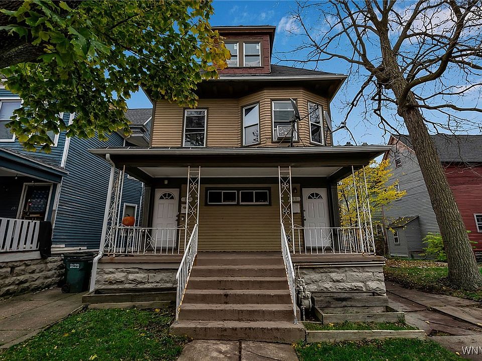 Spacious West Side Duplex with Off-Street Parking! Located at 11 Hoyt Street in a trending, highly walkable neighborhood, this large 2-family home offers 2,848 square feet and is offered at $300,000. Each apartment features a highly desirable 4 bedrooms and 1 bath. The property is 50% occupied, with the upper unit bringing in $1,620/month. The building features excellent mechanical updates, including newer high-efficiency furnaces, circuit breaker electric service, and upgraded plumbing with PEX and PVC. Both units boast original hardwood floors and tons of newer windows. The lower apartment includes an original walk-in pantry, and an updated kitchen with new cabinets and backsplash, and an updated bathroom. The renovated upper apartment showcases an exposed brick fireplace in the dining room, exposed brick in the kitchen, solid wood cabinets with granite counters, and a full appliance package (stove, refrigerator, dishwasher, microwave). The sale also includes the washers and dryers with separate hookups in the basement. Enjoy being walking distance to 5 Points amenities like Butter Block and Remedy House, and biking distance to the Elmwood Village, Empire State Trail, and Hoyt Lake. This is a must-see for investors or owner-occupants seeking character, size, and location.