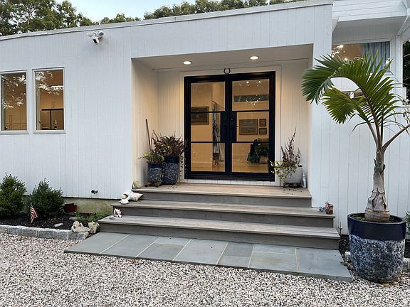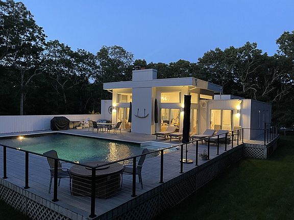 Upon entering through the double glass doors you'll find the open light filled living room with 12' ceiling, wood burning fireplace, views of the pool, yard and atrium. It's a feeling of being outdoors, you can enjoy nature in the day and stargazing at night, all from your Livingroom! The open concept kitchen offers high end appliances including a 6 burner Wolf range, 4 door refrigerator/freezer, hidden coffee bar plus a bar nook. The full guest bath has additional access from the pool deck. The primary bedroom offers as 10' ceiling with walk in closet and a full bath with freestanding tub. Sliders in the primary bedroom lead to a mahogany deck with a private outdoor rain shower. All of the above is on one level with 8' white oak floors throughout. The lower level is partially finished with a laundry room, car area, den, and gym area with egress window. (The gym can be enclosed to add a 4th bedroom). All new utilities including water heater, water pump, combo AC/heat duct system. Total square feet of living space is 2,940 with easy option of a 4th bedroom. New roof, new pool liner and mechanics. The Belgian block lined driveway is convenient for multiple cars. Along the back of the property is an equestrian trail. The large 24' x 24' garage has a 11' high ceiling. Easy close access to the village, 1/2 mile to Round Swamp Farm and 1-1/2 miles to Nick and Toni's.