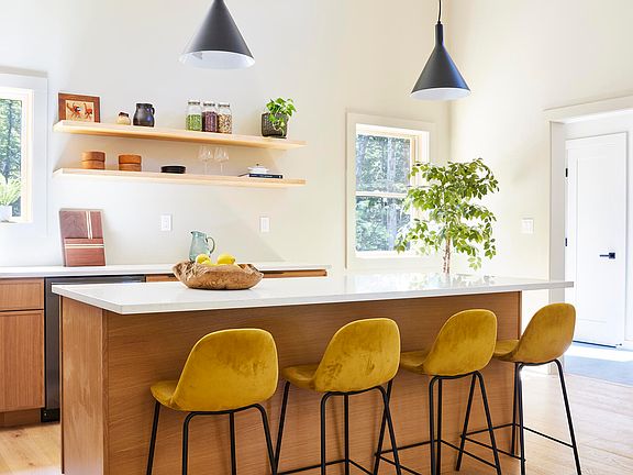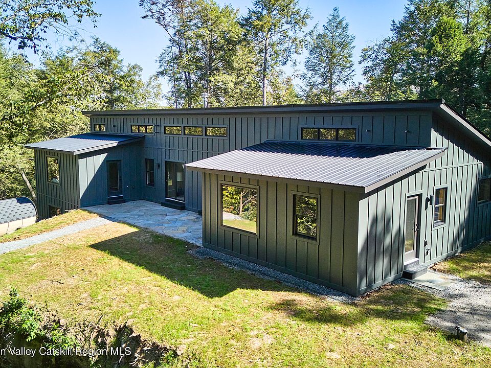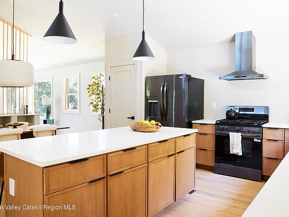 Large picture windows and sliding glass doors anchor the main living space, letting in the surrounding landscape. A modern wood stove warms the home and the heart. Just outside, the fieldstone terrace offers a gradual transition into nature, as well as the perfect spot for outdoor living. Additionally, two of the four bedrooms, including the primary suite, have entrances directly onto this beautiful space.