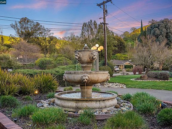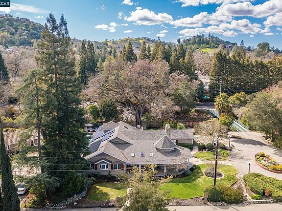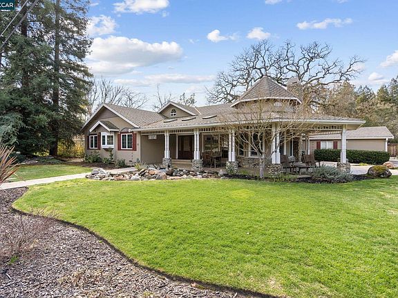 $300k price drop! Offers due 4/18. This lovely Cape Cod style home tucked between Las Trampas & surrounding picturesque hills delivers a huge wrap-around porch, circular driveway w/fountain, vaulted ceilings, maple wood inlaid flooring, gym room, sauna, office/library w/custom cabinetry & exquisite interior millwork. The 4 bedroom 3.5 bathroom single story home offers a spacious kitchen w/tons of cabinetry & counter space, a Viking gas range w/2 ovens, an island w/bar seating & a bright kitchen nook. The relaxing primary bedroom ensuite has a walk-in closet, dual sinks, sky lights, true steam shower & a quaint sitting area overlooking the colorful yard. There's a secondary ensuite w/exterior access, formal dining room w/coffer ceilings, central vacuum, 2 HVAC systems, silhouette shades, gas log fireplace, crystal chandeliers, Pool Solar & Electric Solar Panels paid until 2035. The unexpected bonus is the second story which consists of a giant game room plus walk-in attic storage. The manicured one acre lot offers a sparkling pool, hot tub, outdoor kitchen w/built-in BBQ, multiple outdoor seating & lounging areas, fire pit, lush grass & raised planter boxes w/fruit trees. Ez access to 680, 24, downtown Walnut Creek, Bart, shopping, restaurants, shops, cinema, hiking, parks & more.