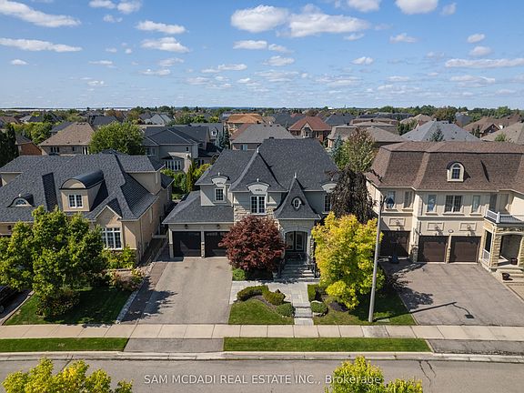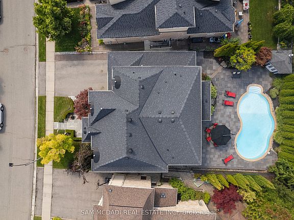 Welcome to this meticulously maintained detached 2-storey home, perfectly situated on a private and exclusive street overlooking a beautiful parkette and green space. Offering 3,534 sq. ft. above grade with 4 bedrooms, 4 bathrooms, main floor office, this residence combines elegance, comfort, and functionality. The exterior is professionally landscaped with mature trees, two serene water features, inground irrigation system, and a stunning saltwater heated pool (3' - 8' depth) with three cascading waterfalls creating your own private backyard oasis. Inside, youll find spacious principal rooms and an open-concept kitchen with a center island, stone countertops, built-in desk, stainless steel appliances, and direct flow into the living area featuring a custom wall unit and cozy gas fireplace. Elegant dining room leading to 2 storey living room perfect for entertaining. Open oak staircase with wrought iron balusters. Hardwood flooring, crown molding, pot lights throughout and custom walk-in closets in all bedrooms elevate the homes style and practicality. The primary retreat boasts a walk-in closet and a luxurious 5-piece ensuite. New countertops in all bathrooms, upgraded hardwood on the second level and new front door/entry way. Security system with cameras. Parking is never an issue with a 3-car tandem garage and room for 5 more on the driveway8 total spaces. This rare offering blends luxury, privacy, and convenience, all in an exceptional setting.