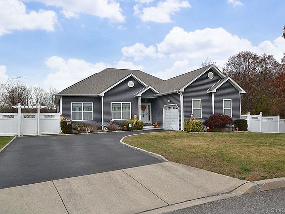 This stunning 3 bedroom, 2 bath young custom ranch is everything you have been searching for. Wide open living. Beautiful large entry foyer that opens into a sun filled family room complete with a gas fireplace, hardwood flooring throughout, crown molding, formal dining room, spacious eat in kitchen with granite counter tops and stainless steel appliances, large primary bedroom with en-suite, laundry room, huge basement with walkout entrance and high ceilings, walk up attic with huge picture window that can easily be converted to living space, one car garage, gas heat and cooking, CAC, separate gas hot water heater and solar panels. This beautiful large property is fully fenced with an oversized patio, in ground sprinkler system, house alarm system and sewers. This beauty sits at the end of a cul de sac in the Middle Country School District. You don't want to miss this one.!!