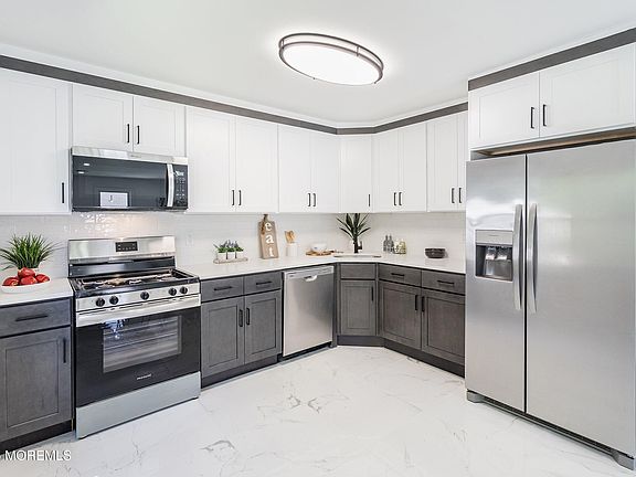 The kitchen is equipped with brand new appliances along with functional cabinetry and luxurious quartz countertops.
