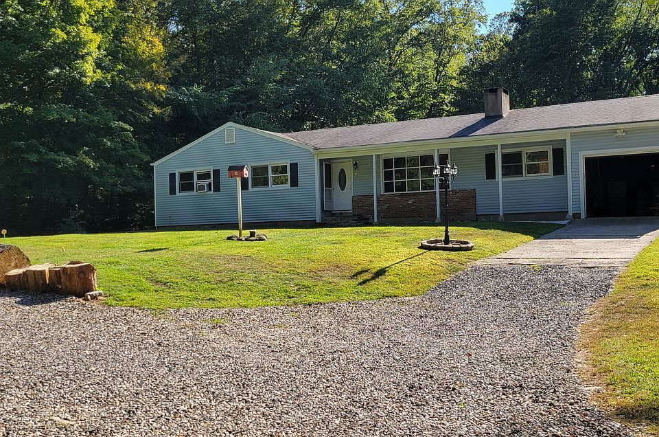 4 bedroom 2 bath ranch style home in private setting, hardwood floors through out, updated kitchen and bathrooms, dining room, den, living room with fireplace, primary bedroom with its own bathroom, full basement, large yard, rear brick patio. Private Road maintained and responsibility of 4 property owners on street.