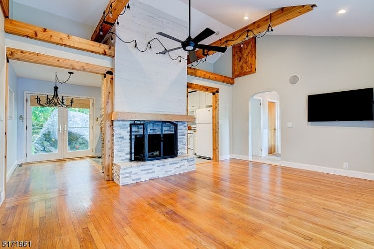 BACK ON THE MARKET-Buyer could not perform. Enjoy Lake Life! Beautiful renovated 3 bedroom 1 bathroom Expanded Ranch located in quiet street w Year Round Lake View. Wide Driveway and Front Entrance welcomes you to Natural Stone accent wall+ceramic tile Foyer. Beautiful high ceiling living room w Cedar-Wrapped Wood Beams, Natural Stacked Stone Veneer Fireplace. Interior Wired with Surround Speakers and Internet CAT5 Ethernet Cables. Lots of sunlight in the house that features Hardwood Flooring with a lovely Eat-in Kitchen, White Cabinetry, Recessed Lighting, subway style backsplash and a detailed stone wall. Anderson Double Swing Glass Doors leads you to your shaded backyard. Beautiful master bedroom w ceiling fan+ 2 bedrooms w recessed lighting. Walls upgraded with ROCKWOOL Sound absorbency-Fire Retardant Insulation. Other upgrades included: Whole-House Water Filtration System by Culligan plus their Aqua-Cleer Advanced Reverse Osmosis System for top-quality drinking water, Whole house fan, Electric box upgraded to 200 Amps + new electric wiring throughout. Ground floor+basement plumbing has been upgraded as well. Electric Water Heater is 1 Year old. Relax at the Hopatcong Homestead Beach just down the road with docking rights for your boat or jet-ski. All available to you as a deeded member for an annual fee. The HHBA Registration is optional. Walking distance to the Beach Club. Minutes from State Park, shopping, dining and major highways.SOLD AS IS.
